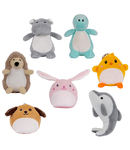 Soft plush character key rings - grey dolphin, grey hippo, light brown dog, light brown hedgehog, pink bunny, turquoise dinosaur and yellow chick.Clip on attachment.White colour panel on tummy.Height ranges from 9cm up to 13cm.Suitable for DFT, vinyl print and sublimation.
